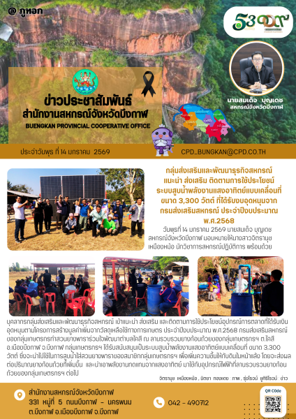 วันพุธที่ 14 มกราคม 2569 นายสมเด็จ บุญเดช สหกรณ์จังหวัดบึงกาฬ มอบหมายให้นางสาวจิตรานุช เหมืองหม้อ นักวิชาการสหกรณ์ปฏิบัติการ พร้อมด้วยบุคลากรกลุ่มส่งเสริมและพัฒนาธุรกิจสหกรณ์ เข้าแนะนำ ส่งเสริม และติดตามการใช้ประโยชน์อุปกรณ์การตลาดที่ได้รับเงินอุดหนุนตามโครงการสร้างมูลค่าเพิ่มจากวัสดุเหลือใช้ทางการเกษตร ประจำปีงบประมาณ พ.ศ.2568 กรมส่งเสริมสหกรณ์ ของกลุ่มเกษตรกรทำสวนยางพาราร่วมใจพัฒนาตำบลไคสี ณ ลานรวบรวมยางก้อนถ้วยของกลุ่มเกษตรกรฯ ต.ไคสี อ.เมืองบึงกาฬ จ.บึงกาฬ กลุ่มเกษตรกรฯ ได้รับสนับสนุนเป็นระบบสูบน้ำพลังงานแสงอาทิตย์แบบเคลื่อนที่ ขนาด 3,300 วัตต์ ซึ่งจะนำไปใช้ในการสูบน้ำใส่สวนยางพาราของสมาชิกกลุ่มเกษตรกรฯ เพื่อเพิ่มความชื้นให้กับดินในหน้าแล้ง โดยจะส่งผลต่อปริมาณยางก้อนถ้วยที่เพิ่มขึ้น และนำเอาพลังงานทดแทนจากแสงอาทิตย์ มาใช้กับอุปกรณ์ไฟฟ้าที่ลานรวบรวมยางก้อนถ้วยของกลุ่มเกษตรกรฯ ต่อไป