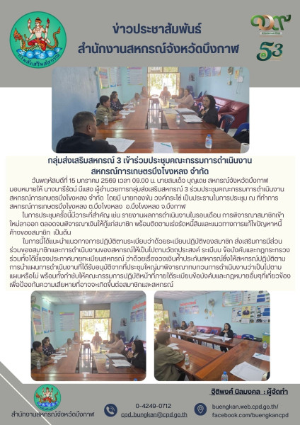 วันพฤหัสบดีที่ 15 มกราคม 2569 เวลา 09.00 น. นายสมเด็จ บุญเดช สหกรณ์จังหวัดบึงกาฬ มอบหมายให้ นางนารีรัตน์ มีแสง ผู้อำนวยการกลุ่มส่งเสริมสหกรณ์ 3 ร่วมประชุมคณะกรรมการดำเนินงาน สหกรณ์การเกษตรบึงโขงหลง จำกัด โดยมี นายทองขัน วงค์กระโซ่ เป็นประธานในการประชุม ณ ที่ทำการสหกรณ์การเกษตรบึงโขงหลง ต.บึงโขงหลง อ.บึงโขงหลง จ.บึงกาฬ