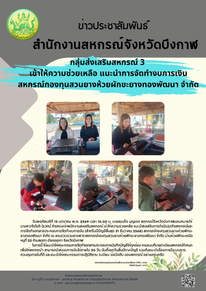 วันพฤหัสบดีที่ 15 มกราคม พ.ศ. 2569 เวลา 10.00 น. นายสมเด็จ บุญเดช สหกรณ์จังหวัดบึงกาฬ มอบหมายให้นางสาวจีรโชติ นิเวศน์ ตำแหน่งเจ้าพนักงานส่งเสริมสหกรณ์ เข้าให้ความช่วยเหลือ แนะนำส่งเสริมการดำเนินธุรกิจสหกรณ์และการจัดทำเอกสารประกอบการจัดทำงบการเงิน (สำหรับปีบัญชีสิ้นสุด 31 ธันวาคม 2568) สหกรณ์กองทุนสวนยางห้วยผักขะยางทองพัฒนา จำกัด ณ ลานรวบรวมยางพาราสหกรณ์กองทุนสวนยางห้วยผักขะยางทองพัฒนา จำกัด บ้านห้วยผักขะเหนือ หมู่ที่ 22 ตำบลเซกา อำเภอเซกา จังหวัดบึงกาฬ