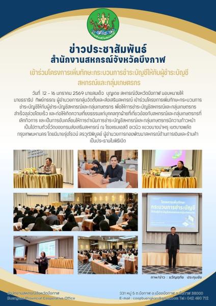 วันที่ 12 - 16 มกราคม 2569 นายสมเด็จ บุญเดช สหกรณ์จังหวัดบึงกาฬ มอบหมายให้นายธราธิป ทิพย์กรรณ ผู้อำนวยการกลุ่มจัดตั้งและส่งเสริมสหกรณ์ เข้าร่วมโครงการเพิ่มทักษะกระบวนการชำระบัญชีให้กับผู้ชำระบัญชีสหกรณ์และกลุ่มเกษตรกร เพื่อให้การชำระบัญชีสหกรณ์และกลุ่มเกษตรกรสำเร็จลุล่วงโดยเร็ว และก่อให้เกิดความเที่ยงธรรมแก่บุคคลทุกฝ่ายที่เกี่ยวข้องกับสหกรณ์และกลุ่มเกษตรกรที่เลิกกิจการ และเป็นการขับเคลื่อนให้การดำเนินการชำระบัญชีสหกรณ์และกลุ่มเกษตรกรมีความก้าวหน้าเป็นไปตามตัวชี้วัดของกรมส่งเสริมสหกรณ์ ณ โรงแรมเอสดี อเวนิว แขวงบางบำหรุ เขตบางพลัด กรุงเทพมหานคร โดยมีนายรุ่งโรจน์ สรวุฒิพิบูลย์ ผู้อำนวยการกองพัฒนาสหกรณ์ด้านการเงินและร้านค้า เป็นประธานในพิธีเปิด
