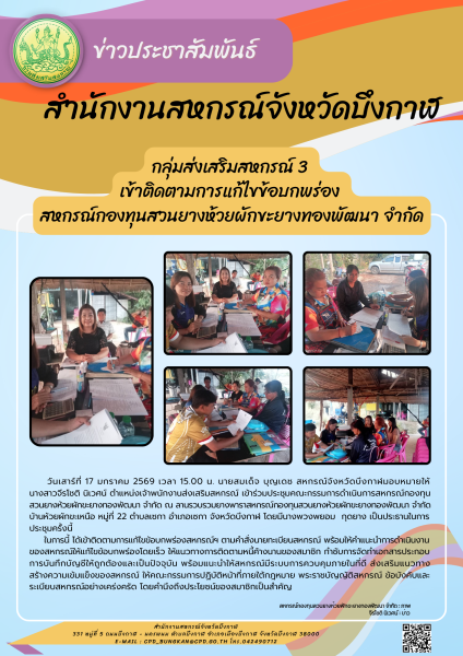 วันเสาร์ที่ 17 มกราคม 2569 เวลา 15.00 น. นายสมเด็จ บุญเดช สหกรณ์จังหวัดบึงกาฬ มอบหมายให้ นางสาวจีรโชติ นิเวศน์ ตำแหน่งเจ้าพนักงานส่งเสริมสหกรณ์ เข้าร่วมประชุมคณะกรรมการดำเนินการสหกรณ์กองทุนสวนยางห้วยผักขะยางทองพัฒนา จำกัด ณ ลานรวบรวมยางพาราสหกรณ์กองทุนสวนยางห้วยผักขะยางทองพัฒนา จำกัด บ้านห้วยผักขะเหนือ หมู่ที่ 22 ตำบลเซกา อำเภอเซกา จังหวัดบึงกาฬ โดยมีนางพวงพยอม กุดยาง เป็นประธานในการประชุมครั้งนี้