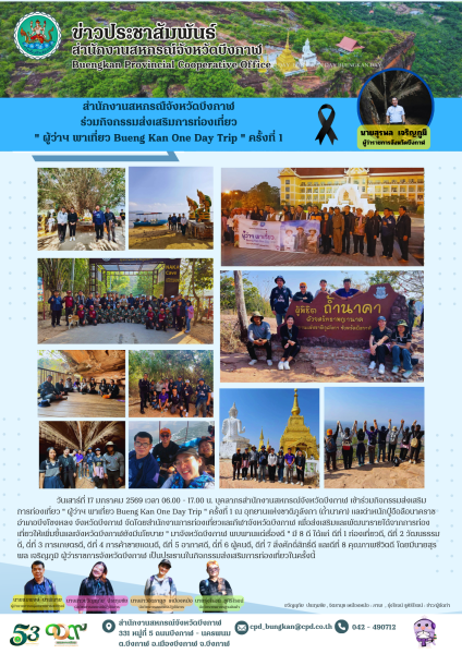 วันเสาร์ที่ 17 มกราคม 2569 เวลา 06.00 - 17.00 น. บุคลากรสำนักงานสหกรณ์จังหวัดบึงกาฬ เข้าร่วมกิจกรรมส่งเสริมการท่องเที่ยว " ผู้ว่าฯ พาเที่ยว Bueng Kan One Day Trip " ครั้งที่ 1 ณ อุทยานแห่งชาติภูลังกา (ถ้ำนาคา) และตำหนักปู่อือลือนาคราช อำเภอบึงโขงหลง จังหวัดบึงกาฬ จัดโดยสำนักงานการท่องเที่ยวและกีฬาจังหวัดบึงกาฬ เพื่อส่งเสริมและพัฒนารายได้จากการท่องเที่ยวให้เพิ่มขึ้นและจังหวัดบึงกาฬยังมีนโยบาย " มาจังหวัดบึงกาฬ พบพานแต่เรื่องดี " มี 8 ดี ได้แก่ ดีที่ 1 ท่องเที่ยวดี, ดีที่ 2 วัฒนธรรมดี, ดี่ที่ 3 การเกษตรดี, ดีที่ 4 การค้าชายแดนดี, ดีที่ 5 อากาศดี, ดี่ที่ 6 ผู้คนดี, ดีที่ 7 สิ่งศักดิ์สิทธิ์ดี และดีที่ 8 คุณภาพชีวิตดี โดยมีนายสุรพล เจริญภูมิ ผู้ว่าราชการจังหวัดบึงกาฬ เป็นประธานในกิจกรรมส่งเสริมการท่องเที่ยวในครั้งนี้