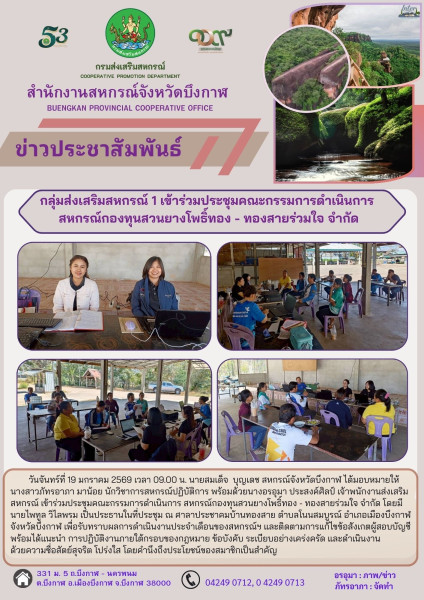 วันจันทร์ที่ 19 มกราคม 2569 เวลา 09.00 น. นายสมเด็จ บุญเดช สหกรณ์จังหวัดบึงกาฬ ได้มอบหมายให้ นางสาวภัทรอาภา มาน้อย นักวิชาการสหกรณ์ปฏิบัติการ พร้อมด้วยนางอรอุมา ประสงค์ศิลป์ เจ้าพนักงานส่งเสริมสหกรณ์ เข้าร่วมประชุมคณะกรรมการดำเนินการ สหกรณ์กองทุนสวนยางโพธิ์ทอง - ทองสายร่วมใจ จำกัด โดยมีนายไพทูล วิไลพรม เป็นประธานในที่ประชุม ณ ศาลาประชาคมบ้านทองสาย ตำบลโนนสมบูรณ์ อำเภอเมืองบึงกาฬ จังหวัดบึงกาฬ เพื่อรับทราบผลการดำเนินงานประจำเดือนของสหกรณ์ฯ และติดตามการแก้ไขข้อสังเกตผู้สอบบัญชี พร้อมได้แนะนำ การปฏิบัติงานภายใต้กรอบของกฎหมาย ข้อบังคับ ระเบียบอย่างเคร่งครัด และดำเนินงานด้วยความซื่อสัตย์สุจริต โปร่งใส โดยคำนึงถึงประโยชน์ของสมาชิกเป็นสำคัญ
