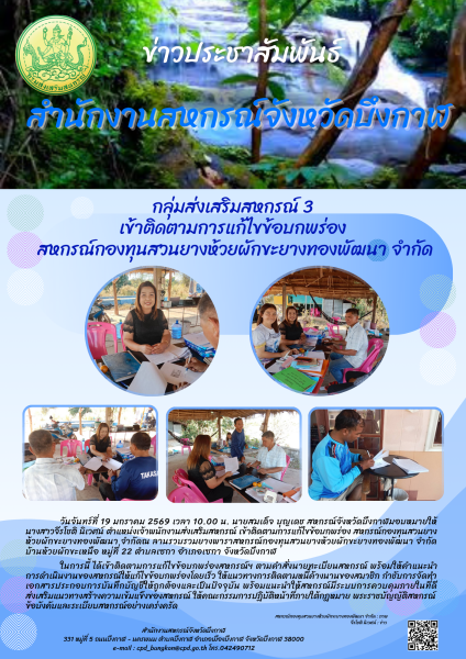 วันจันทร์ที่ 19 มกราคม 2569 เวลา 10.00 น. นายสมเด็จ บุญเดช สหกรณ์จังหวัดบึงกาฬ มอบหมายให้ นางสาวจีรโชติ นิเวศน์ ตำแหน่งเจ้าพนักงานส่งเสริมสหกรณ์ เข้าติดตามการแก้ไขข้อบกพร่อง สหกรณ์กองทุนสวนยางห้วยผักขะยางทองพัฒนา จำกัด ณ ลานรวบรวมยางพาราสหกรณ์กองทุนสวนยางห้วยผักขะยางทองพัฒนา จำกัด บ้านห้วยผักขะเหนือ หมู่ที่ 22 ตำบลเซกา อำเภอเซกา จังหวัดบึงกาฬ