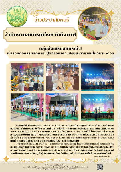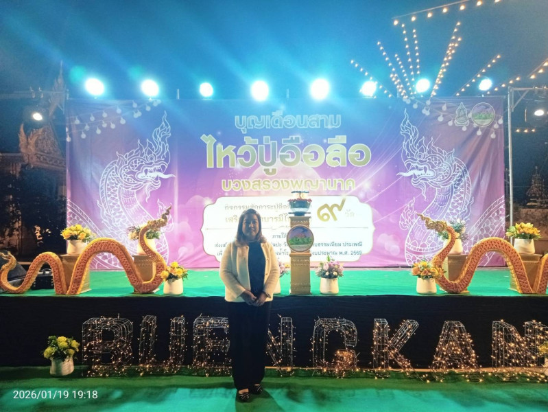 วันจันทร์ที่ 19 มกราคม 2569 เวลา 17.30 น. นายสมเด็จ บุญเดช สหกรณ์จังหวัดบึงกาฬ มอบหมายให้นางสาวจีรโชติ นิเวศน์ ตำแหน่งเจ้าพนักงานส่งเสริมสหกรณ์ เข้าร่วมกิจกรรมสักการะ ปู่อือลือนาคา เสริมชะตาบารมีไหว้พระ 9 วัด ภายใต้โครงการส่งเสริมการอนุรักษ์ฟื้นฟู ศิลปะ วัฒนธรรม ขนบธรรมเนียม ประเพณี เพื่อส่งเสริมการท่องเที่ยวลุ่มน้ำโขง ประจำปีงบประมาณ พ.ศ. 2569 ณ บริเวณตำหนักปูถือลือนาคราช บ้านดอนกลาง หมู่ที่ 1 ตำบลบึงโขงหลง อำเภอบึงโขงหลง จังหวัดบึงกาฬ เพื่อขับเคลื่อน Soft Power ด้วยมิติทางวัฒนธรรม โดยการนำทุนทางวัฒนธรรมที่มีความเป็นอัตลักษณ์ของจังหวัดบึงกาฬ มาพัฒนาต่อยอดด้วยความคิดสร้างสรรค์และส่งเสริมการท่องเที่ยวด้วยมิติทางวัฒนธรรม สร้างรายได้ กระตุ้นการท่องเที่ยวในจังหวัดบึงกาฬ โดยมีนายสุรพล เจริญภูมิ ผู้ว่าราชการจังหวัดบึงกาฬ เป็นประธานในกิจกรรมในครั้งนี้