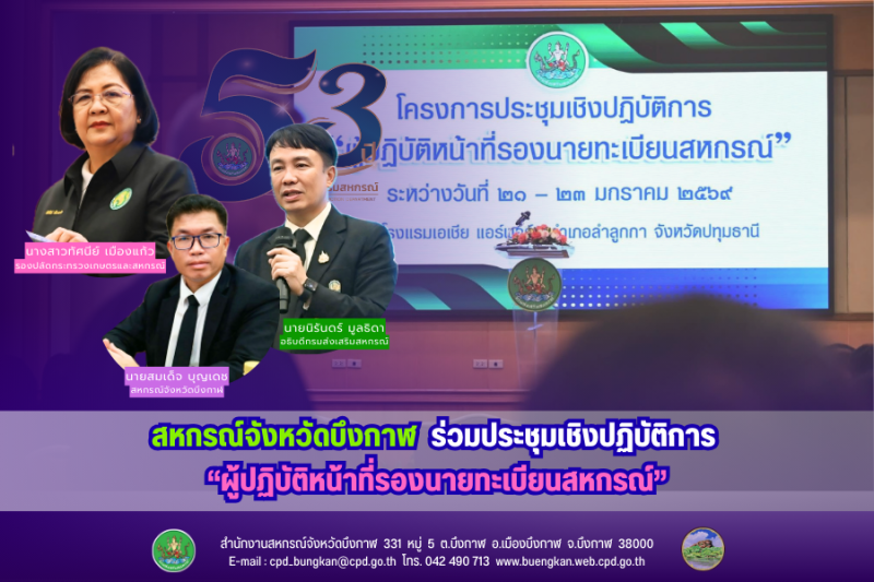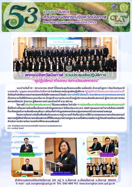 ระหว่างวันที่ 21 - 23 มกราคม 2569 ที่ห้องประชุมโรงแรมเอเชีย แอร์พอร์ท อำเภอลำลูกกา จังหวัดปทุมธานี นายสมเด็จ บุญเดช สหกรณ์จังหวัดบึงกาฬ ร่วมโครงการประชุมเชิงปฏิบัติการ “ผู้ปฏิบัติหน้าที่รองนายทะเบียนสหกรณ์” จัดโดยสำนักพัฒนาและถ่ายทอดเทคโนโลยีการสหกรณ์ โดยมีนางสาวทัศนีย์ เมืองแก้ว รองปลัดกระทรวงเกษตรและสหกรณ์ เป็นประธานในพิธีเปิดและมอบนโยบาย มีกลุ่มเป้าหมายประกอบด้วยผู้บริหารกรมส่งเสริมสหกรณ์ ผู้ตรวจราชการกรม สหกรณ์จังหวัด วิทยากร ผู้สังเกตการณ์ และเจ้าหน้าที่ รวม 120 คน