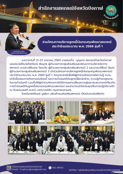 ระหว่างวันที่ 21-23 มกราคม 2569 นายสมเด็จ บุญเดช สหกรณ์จังหวัดบึงกาฬ มอบหมายให้นายไพรโรจน์ ชัยบุตร ผู้อำนวยการกลุ่มส่งเสริมและพัฒนาการบริหารจัดการสหกรณ์ นางสาวสิริเนตร โพระกัน ผู้อำนวยการกลุ่มส่งเสริมสหกรณ์ 2 และนางนารีรีตน์ มีแสง ผู้อำนวยการกลุ่มส่งเสริมสหกรณ์ 3 เข้าร่วมโครงการบริหารลูกหนี้เงินกองทุนพัฒนาสหกรณ์ ประจำปีงบประมาณ พ.ศ. 2569 รุ่นที่ 1 วัตถุประสงค์เพื่อให้ผู้เข้าร่วมโครงการมีความรู้ความเข้าใจขั้นตอนการติดตามเร่งรัดหนี้ และการดำเนินคดีกับลูกหนี้ผิดนัดชำระ ความรู้ด้านกฎหมายในการดำเนินคดี รวมทั้งให้ผู้เข้าร่วมโครงการได้มีการแลกเปลี่ยนความรู้และประสบการณ์เกี่ยวกับการดำเนินคดีกับลูกหนี้เงินกองทุนพัฒนาสหกรณ์ และสามารถนำไปประยุกต์ในการปฎิบัติงานได้ ณ โรงแรมเอสดี อเวนิว เขตบางพลัด กรุงเทพมหานคร โดยมีนายนิรันดร์ มูลธิดา อธิบดีกรมส่งเสริมสหกรณ์ เป็นประธานในพิธิเปิด
