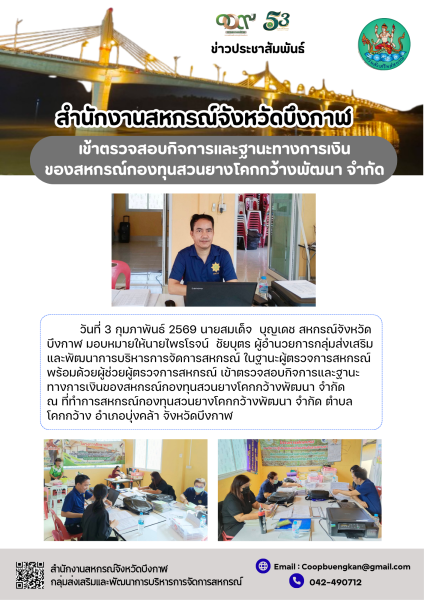 วันที่ 3 กุมภาพันธ์ 2569 นายสมเด็จ บุญเดช สหกรณ์จังหวัดบึงกาฬ มอบหมายให้นายไพรโรจน์ ชัยบุตร ผู้อำนวยการกลุ่มส่งเสริมและพัฒนาการบริหารการจัดการสหกรณ์ ในฐานะผู้ตรวจการสหกรณ์ พร้อมด้วยผู้ช่วยผู้ตรวจการสหกรณ์ เข้าตรวจสอบกิจการและฐานะทางการเงินของสหกรณ์กองทุนสวนยางโคกกว้างพัฒนา จำกัด ณ ที่ทำการสหกรณ์กองทุนสวนยางโคกกว้างพัฒนา จำกัด ตำบลโคกกว้าง อำเภอบุ่งคล้า จังหวัดบึงกาฬ
