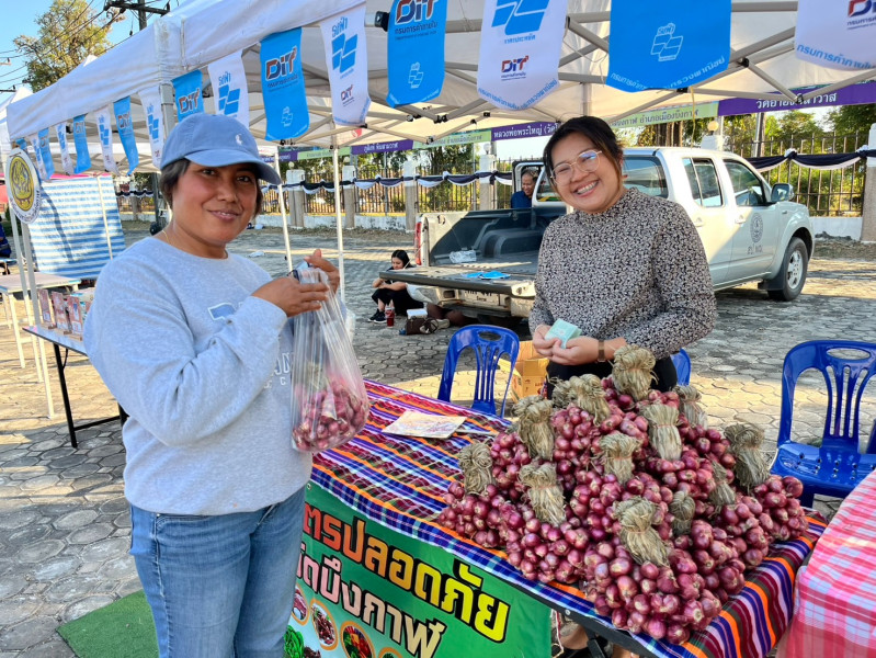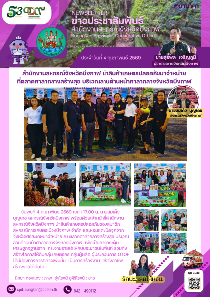 วันพุธ ที่ 4 กุมภาพันธ์ 2569 เวลา 17.00 น. นายสมเด็จ บุญเดช สหกรณ์จังหวัดบึงกาฬ พร้อมด้วยเจ้าหน้าที่สำนักงานสหกรณ์จังหวัดบึงกาฬ นำสินค้าเกษตรปลอดภัยของสมาชิกสหกรณ์การเกษตรเมืองบึงกาฬ จำกัด และหอมแดงมัดจุกจากจังหวัดศรีสะเกษมาจำหน่าย ณ ตลาดศาลากลางสร้างสุข บริเวณลานด้านหน้าศาลากลางจังหวัดบึงกาฬ เพื่อเป็นการกระตุ้นเศรษฐกิจฐานราก กระจายรายได้ให้กับประชาชนในพื้นที่ รวมทั้งสร้างโอกาสให้กับกลุ่มเกษตรกร กลุ่มผู้ผลิต ผู้ประกอบการ OTOP ได้มีช่องทางการตลาดเพิ่มขึ้น เป็นการสร้างงาน สร้างอาชีพ สร้างรายได้ต่อไป