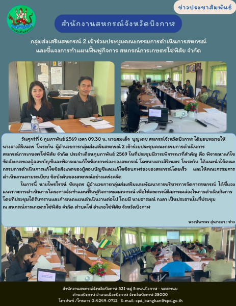 วันศุกร์ที่ 6 กุมภาพันธ์ 2569 เวลา 09.30 น. นายสมเด็จ บุญเดช สหกรณ์จังหวัดบึงกาฬ ได้มอบหมายให้นางสาวสิริเนตร โพระกัน ผู้อำนวยการกลุ่มส่งเสริมสหกรณ์ 2 เข้าร่วมประชุมคณะกรรมการดำเนินการสหกรณ์การเกษตรโซ่พิสัย จำกัด ประจำเดือนกุมภาพันธ์ 2569 ในที่ประชุมมีวาระพิจารณาที่สำคัญ คือ พิจารณาแก้ไขข้อสังเกตของผู้สอบบัญชีและพิจารณาแก้ไขข้อบกพร่องของสหกรณ์ โดยนางสาวสิริเนตร โพระกัน ได้แนะนำให้คณะกรรมการดำเนินการแก้ไขข้อสังเกตของผู้สอบบัญชีและแก้ไขข้อบกพร่องของสหกรณ์โดยเร็ว และให้คณะกรรมการดำเนินงานตามระเบียบ ข้อบังคับของสหกรณ์อย่างเคร่งครัด