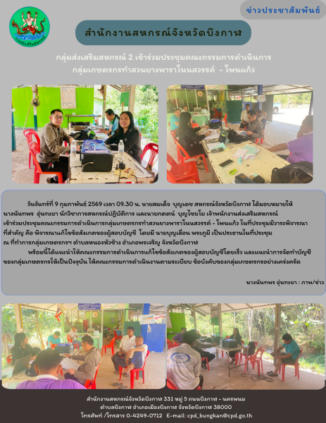 วันจันทร์ที่ 9 กุมภาพันธ์ 2569 เวลา 09.30 น. นายสมเด็จ บุญเดช สหกรณ์จังหวัดบึงกาฬ ได้มอบหมายให้นางนันทพร อุ่นทะยา นักวิชาการสหกรณ์ปฏิบัติการ และนายกตตน์ บุญไชยโย เจ้าพนักงานส่งเสริมสหกรณ์ เข้าร่วมประชุมคณะกรรมการดำเนินการกลุ่มเกษตรกรทำสวนยางพาราโนนสวรรค์ - โพนแก้ว ในที่ประชุมมีวาระพิจารณาที่สำคัญ คือ พิจารณาแก้ไขข้อสังเกตของผู้สอบบัญชี โดยมี นายบุญเลื่อน พระภูมี เป็นประธานในที่ประชุม ณ ที่ทำการกลุ่มเกษตรกรฯ ตำบลหนองหัวช้าง อำเภอพรเจริญ จังหวัดบึงกาฬ