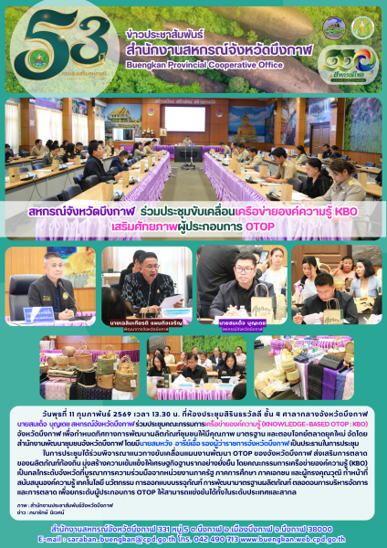 วันพุธที่ 11 กุมภาพันธ์ 2569 เวลา 13.30 น. ที่ห้องประชุมสิรินธรวัลลี ชั้น 4 ศาลากลางจังหวัดบึงกาฬ นายสมเด็จ บุญเดช สหกรณ์จังหวัดบึงกาฬ ร่วมประชุมคณะกรรมการเครือข่ายองค์ความรู้ (Knowledge–Based OTOP : KBO) จังหวัดบึงกาฬ เพื่อกำหนดทิศทางการพัฒนาผลิตภัณฑ์ชุมชนให้มีคุณภาพ มาตรฐาน และตอบโจทย์ตลาดยุคใหม่ จัดโดยสำนักงานพัฒนาชุมชนจังหวัดบึงกาฬ โดยมีนายสมหวัง อารีย์เอื้อ รองผู้ว่าราชการจังหวัดบึงกาฬ เป็นประธานในการประชุม