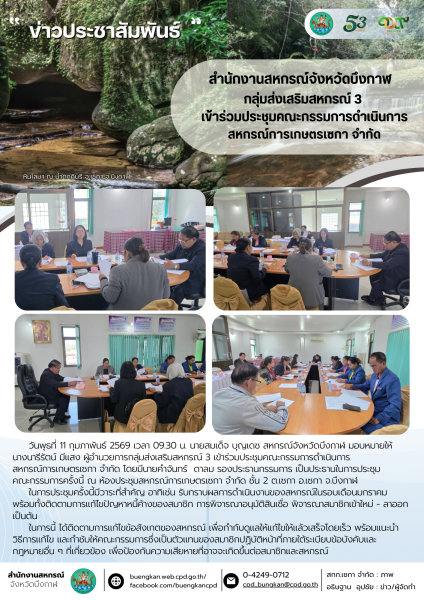 วันพุธที่ 11 กุมภาพันธ์ 2569 เวลา 09.30 น. นายสมเด็จ บุญเดช สหกรณ์จังหวัดบึงกาฬ มอบหมายให้ นางนารีรัตน์ มีแสง ผู้อำนวยการกลุ่มส่งเสริมสหกรณ์ 3 เข้าร่วมประชุมคณะกรรมการดำเนินการ สหกรณ์การเกษตรเซกา จำกัด โดยมีนายคำจันทร์ ดาลม รองประธานกรรมการ เป็นประธานในการประชุม คณะกรรมการครั้งนี้ ณ ห้องประชุมสหกรณ์การเกษตรเซกา จำกัด ชั้น 2 ต.เซกา อ.เซกา จ.บึงกาฬ