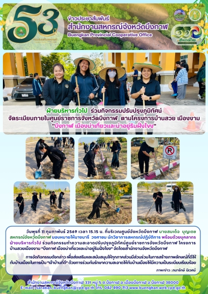 วันพุธที่ 11 กุมภาพันธ์ 2569 เวลา 15.15 น. ที่บริเวณศูนย์จังหวัดบึงกาฬ นายสมเด็จ บุญเดช สหกรณ์จังหวัดบึงกาฬ มอบหมายให้นางนารี วงศาชม นักวิชาการสหกรณ์ปฏิบัติการ พร้อมด้วยบุคลากรฝ่ายบริหารทั่วไป ร่วมกิจกรรมทำความสะอาดปรับปรุงภูมิทัศน์ศูนย์ราชการจังหวัดบึงกาฬ โครงการบ้านสวยเมืองงาม "บึงกาฬ เมืองน่าเที่ยวและน่าอยู่ริมฝั่งโขง" จัดโดยสำนักงานจังหวัดบึงกาฬ