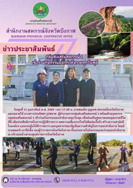 วันพุธที่ 11 กุมภาพันธ์ พ.ศ. 2569 เวลา 17.00 น. นายสมเด็จ บุญเดช สหกรณ์จังหวัดบึงกาฬ มอบหมายให้ นางสาวประภัสสร รูปสอาด ผู้อำนวยการกลุ่มส่งเสริมสหกรณ์ 1 พร้อมด้วยบุคลากรกลุ่มส่งเสริมสหกรณ์ 1 เข้าร่วมกิจกรรมออกกำลังกายทุกวันพุธ เพื่อส่งเสริมสุขภาพและคุณภาพชีวิตที่ดี เพิ่มประสิทธิภาพในการปฏิบัติราชการ ลดความเสี่ยงจากโรคไม่ติดต่อเรื้อรัง สร้างความสามัคคีในองค์กร และกระตุ้นให้ข้าราชการ และบุคลากรของรัฐเห็นความสำคัญในการออกกำลังกาย โดยมีนายสมหวัง อารีย์เอื้อ รองผู้ว่าราชการจังหวัดบึงกาฬ เป็นประธานในกิจกรรมและร่วมออกกำลังกาย