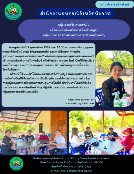 วันพฤหัสบดีที่ 12 กุมภาพันธ์ 2569 เวลา 13.30 น. นายสมเด็จ บุญเดช สหกรณ์จังหวัดบึงกาฬ ได้มอบหมายให้ นางสาวสิริเนตร โพระกัน ผู้อำนวยการกลุ่มส่งเสริมสหกรณ์ 2 พร้อมด้วยบุคลากรกลุ่มส่งเสริมสหกรณ์ 2 เข้าแนะนำส่งเสริมการจัดทำบัญชี เพื่อให้กลุ่มเกษตรกรจัดทำบัญชีให้ถูกต้องและเป็นปัจจุบัน ณ ที่ทำการกลุ่มเกษตรกรฯ ตำบลถ้ำเจริญ อำเภอโซ่พิสัย จังหวัดบึงกาฬ