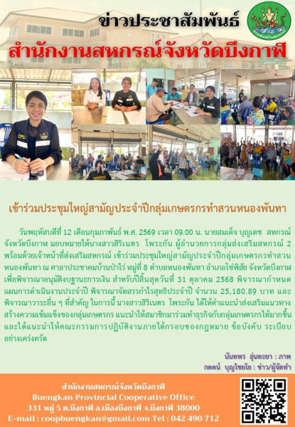 วันพฤหัสบดีที่ 12 เดือนกุมภาพันธ์ พ.ศ. 2569 เวลา 09.00 น. นายสมเด็จ บุญเดช สหกรณ์จังหวัดบึงกาฬ มอบหมายให้นางสาวสิริเนตร โพระกัน ผู้อำนวยการกลุ่มส่งเสริมสหกรณ์ 2 พร้อมด้วยเจ้าหน้าที่ส่งเสริมสหกรณ์ เข้าร่วมประชุมใหญ่สามัญประจำปีกลุ่มเกษตรกรทำสวนหนองพันทา ณ ศาลาประชาคมบ้านป่าไร่ หมู่ที่ 8 ตำบลหนองพันทา อำเภอโซ่พิสัย จังหวัดบึงกาฬ เพื่อพิจารณาอนุมัติงบฐานะการเงิน สำหรับปีสิ้นสุดวันที่ 31 ตุลาคม 2568 พิจารณากำหนดแผนการดำเนินงานประจำปี พิจารณาจัดสรรกำไรสุทธิประจำปี จำนวน 25,10.89 บาท และพิจารณาวาระอื่น ๆ ที่สำคัญ ในการนี้ นางสาวสิริเนตร โพระกัน ได้ให้คำแนะนำส่งเสริมแนวทางสร้างความเข้มแข็งของกลุ่มเกษตรกร แนะนำให้สมาชิกมาร่วมทำธุรกิจกับกลุ่มเกษตรกรให้มากขึ้น และได้แนะนำให้คณะกรรมการปฏิบัติงานภายใต้กรอบของกฎหมาย ข้อบังคับ ระเบียบ อย่างเคร่งครัด