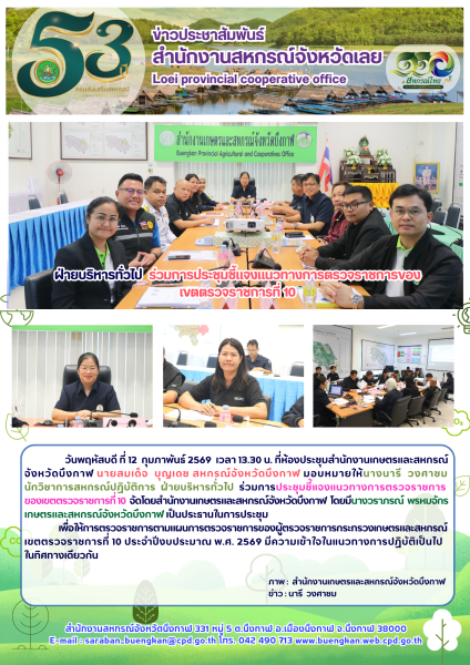 วันพฤหัสบดี ที่ 12 กุมภาพันธ์ 2569 เวลา 13.30 น. ที่ห้องประชุมสำนักงานเกษตรและสหกรณ์จังหวัดบึงกาฬ นายสมเด็จ บุญเดช สหกรณ์จังหวัดบึงกาฬ มอบหมายให้นางนารี วงศาชม นักวิชาการสหกรณ์ปฏิบัติการ ฝ่ายบริหารทั่วไป ร่วมการประชุมชี้แจงแนวทางการตรวจราชการของเขตตรวจราชการที่ 10 จัดโดยสำนักงานเกษตรและสหกรณ์จังหวัดบึงกาฬ โดยมีนางวราภรณ์ พรหมจักร เกษตรและสหกรณ์จังหวัดบึงกาฬ เป็นประธานในการประชุม เพื่อให้การตรวจราชการตามแผนการตรวจราชการของผู้ตรวจราชการกระทรวงเกษตรและสหกรณ์ เขตตรวจราชการที่ 10 ประจำปีงบประมาณ พ.ศ. 2569 มีความเข้าใจในแนวทางการปฏิบัติเป็นไปในทิศทางเดียวกัน