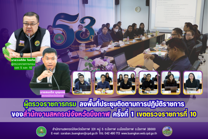 วันอังคารที่ 17 กุมภาพันธ์ 2569 เวลา 09.30 น. ที่ห้องประชุมสำนักงานสหกรณ์จังหวัดบึงกาฬ ชั้น 2 อาคาร 2 นายวงศ์ชัย ไชยโย ผู้ตรวจราชการกรม เขตตรวจราชการที่ 5 และ 10 ลงพื้นที่ประชุมติดตามการปฏิบัติราชการของสำนักงานสหกรณ์จังหวัดบึงกาฬ ครั้งที่ 1 เขตตรวจราชการที่ 10 โดยมีนายสมเด็จ บุญเดช สหกรณ์จังหวัดบึงกาฬ พร้อมด้วยบุคลากรในสังกัด ร่วมต้อนรับและรายงานผลการปฏิบัติราชการ จำนวน 33 คน