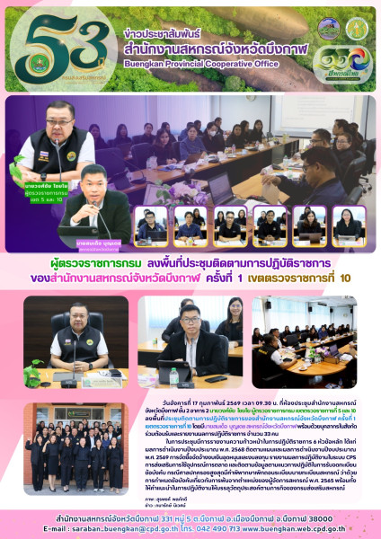 ผู้ตรวจราชการกรม ลงพื้นที่ประชุมติดตามการปฏิบัติราชการ ของสำนักงานสหกรณ์จังหวัดบึงกาฬ ครั้งที่ 1 เขตตรวจราชการที่ 10