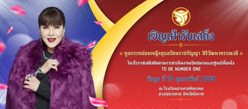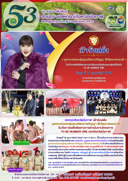 วันพุธที่ 18 กุมภาพันธ์ 2569 เวลา 17.00 น. ที่โรงเรียนปากคาดพิทยาคม อำเภอปากคาด จังหวัดบึงกาฬ นายสมเด็จ บุญเดช สหกรณ์จังหวัดบึงกาฬ ร่วมเฝ้ารับเสด็จทูลกระหม่อมหญิงอุบลรัตนราชกัญญา สิริวัฒนาพรรณวดี ในวโรกาสเสด็จติดตามการดำเนินงานเปิดชมรม TO BE NUMBER ONE และศูนย์เพื่อนใจ TO BE NUMBER ONE และทรงเป็นประธานในการเปิดการแสดงคอนเสิร์ต TO BE NUMBER ONE ของโรงเรียนปากคาดพิทยาคม โดยมีนายสุรพล เจริญภูมิ ผู้ว่าราชการจังหวัดบึงกาฬ พร้อมด้วยนายธเนตร มีรัตน์ ผู้อำนวยการโรงเรียนปากคาดพิทยาคม คณะครู นักเรียน และหัวหน้าส่วนราชการพื้นที่จังหวัดบึงกาฬ เฝ้ารับเสด็จ