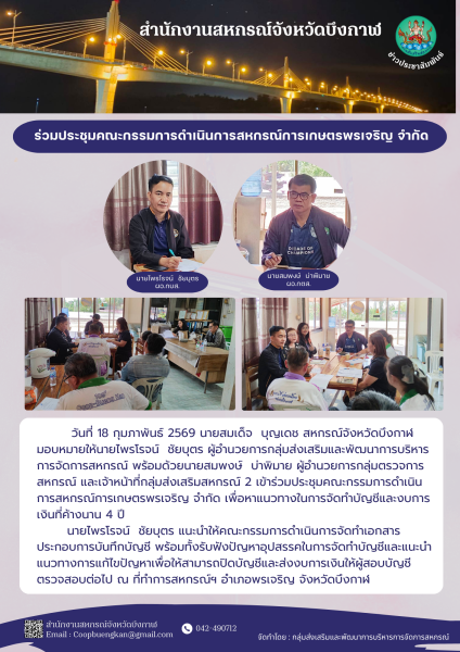 วันที่ 18 กุมภาพันธ์ 2569 นายสมเด็จ บุญเดช สหกรณ์จังหวัดบึงกาฬ มอบหมายให้นายไพรโรจน์ ชัยบุตร ผู้อำนวยการกลุ่มส่งเสริมและพัฒนาการบริหารการจัดการสหกรณ์ พร้อมด้วยนายสมพงษ์ บ่าพิมาย ผู้อำนวยการกลุ่มตรวจการสหกรณ์ และเจ้าหน้าที่กลุ่มส่งเสริมสหกรณ์ 2 เข้าร่วมประชุมคณะกรรมการดำเนินการสหกรณ์การเกษตรพรเจริญ จำกัด เพื่อหาแนวทางในการจัดทำบัญชีและงบการเงินที่ค้างนาน 4 ปี