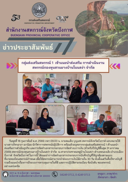 วันพุธที่ 18 กุมภาพันธ์ พ.ศ. 2569 เวลา 09.00 น. นายสมเด็จ บุญเดช สหกรณ์จังหวัดบึงกาฬ มอบหมายให้นางสาวภัทรอาภา มาน้อย นักวิชาการสหกรณ์ปฏิบัติการ พร้อมด้วยบุคลากรกลุ่มส่งเสริมสหกรณ์ 1 เข้าแนะนำส่งเสริมการดำเนินธุรกิจ และการจัดทำเอกสารประกอบการจัดทำงบการเงิน (สำหรับปีบัญชีสิ้นสุด 31 มกราคม 2569) สหกรณ์กองทุนสวนยางบ้านโนนสง่า จำกัด ณ ศาลาประชาคมหมู่บ้านโนนสง่า ตำบลหนองเลิง อำเภอเมืองบึงกาฬ จังหวัดบึงกาฬ ในการนี้ ได้แนะนำการจัดทำเอกสารประกอบการบันทึกบัญชีให้ถูกต้อง ตามแบบที่นายทะเบียนสหกรณ์กำหนด เพื่อให้สหกรณ์สามารถนำส่งงบการเงินได้ภายใน 30 วัน นับตั้งแต่วันสิ้นปีทางบัญชี รวมถึงแนะนำเรื่องการมีระบบการควบคุมภายในที่ดี และการปฏิบัติตามระเบียบ ข้อบังคับ ของสหกรณ์อย่างเคร่งครัด