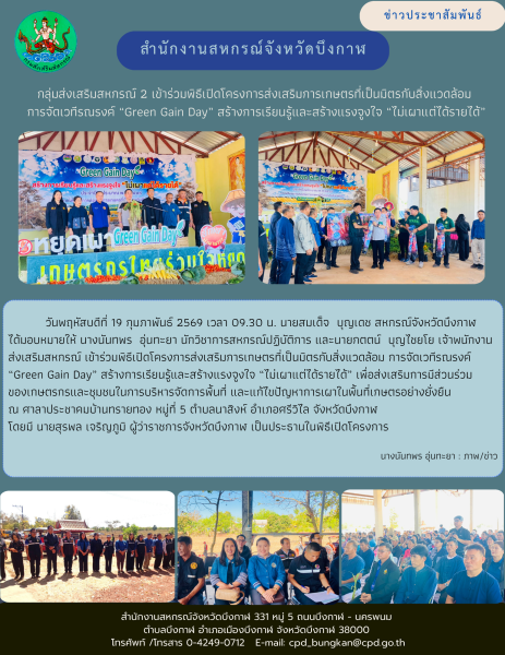 วันพฤหัสบดีที่ 19 กุมภาพันธ์ 2569 เวลา 09.30 น. นายสมเด็จ บุญเดช สหกรณ์จังหวัดบึงกาฬ ได้มอบหมายให้ นางนันทพร อุ่นทะยา นักวิชาการสหกรณ์ปฏิบัติการ และนายกตตน์ บุญไชยโย เจ้าพนักงานส่งเสริมสหกรณ์ เข้าร่วมพิธีเปิดโครงการส่งเสริมการเกษตรที่เป็นมิตรกับสิ่งแวดล้อม การจัดเวทีรณรงค์ “Green Gain Day” สร้างการเรียนรู้และสร้างแรงจูงใจ “ไม่เผาแต่ได้รายได้” เพื่อส่งเสริมการมีส่วนร่วมของเกษตรกรและชุมชนในการบริหารจัดการพื้นที่ และแก้ไขปัญหาการเผาในพื้นที่เกษตรอย่างยั่งยืน ณ ศาลาประชาคมบ้านทรายทอง หมู่ที่ 5 ตำบลนาสิงห์ อำเภอศรีวิไล จังหวัดบึงกาฬ โดยมี นายสุรพล เจริญภูมิ ผู้ว่าราชการจังหวัดบึงกาฬ เป็นประธานในพิธีเปิดโครงการ