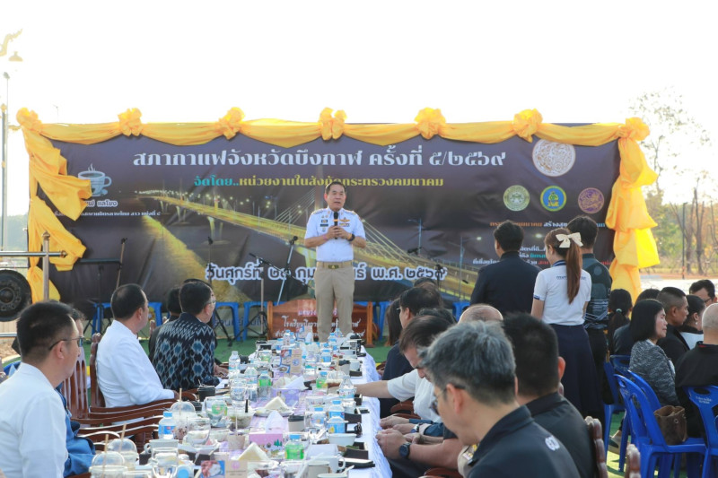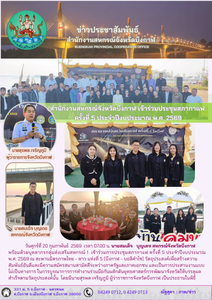 วันศุกร์ที่ 20 กุมภาพันธ์ 2569 เวลา 07.00 น. นายสมเด็จ บุญเดช สหกรณ์จังหวัดบึงกาฬ พร้อมด้วยบุคลากรกลุ่มส่งเสริมสหกรณ์ 1 เข้าร่วมการประชุมสภากาแฟ ครั้งที่ 5 ประจำปีงบประมาณ พ.ศ. 2569 ณ สะพานมิตรภาพไทย - ลาว แห่งที่ 5 (บึงกาฬ - บอลิคำไซ) วัตถุประสงค์เพื่อสร้างความสัมพันธ์อันดีและมีความสมัครสมานสามัคคีระหว่างภาครัฐและภาคเอกชน และเป็นการประสานงานแบบไม่เป็นทางการในการบูรณาการการทำงานร่วมมือกันผลักดันยุทธศาสตร์การพัฒนาจังหวัดให้บรรลุผลสำเร็จตามวัตถุประสงค์นั้น โดยมีนายสุรพล เจริญภูมิ ผู้ว่าราชการจังหวัดบึงกาฬ เป็นประธานในพิธี