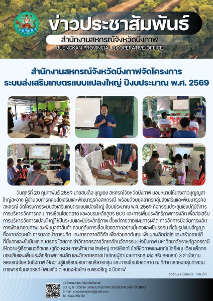 วันศุกร์ที่ 20 กุมภาพันธ์ 2569 นายสมเด็จ บุญเดช สหกรณ์จังหวัดบึงกาฬ มอบหมายให้นางสาวบุญญดา ใหญ่สะอาด ผู้อำนวยการกลุ่มส่งเสริมและพัฒนาธุรกิจสหกรณ์ พร้อมด้วยบุคลากรกลุ่มส่งเสริมและพัฒนาธุรกิจสหกรณ์ จัดโครงการระบบส่งเสริมเกษตรแบบแปลงใหญ่ ปีงบประมาณ พ.ศ. 2569 กิจกรรมประชุมเชิงปฏิบัติการ การบริหารจัดการกลุ่ม การเชื่อมโยงตลาด และอบรมหลักสูตร BCG และการเพิ่มประสิทธิภาพการผลิต เพื่อส่งเสริมการบริหารจัดการแปลงใหญ่ให้เป็นระบบและมีประสิทธิภาพ ตั้งแต่การวางแผนการผลิต การจัดการปัจจัยการผลิต การพัฒนาคุณภาพและเพิ่มมูลค่าสินค้า ควบคู่กับการเชื่อมโยงตลาดอย่างมั่นคงและเป็นธรรม ทั้งในรูปแบบสัญญาซื้อขายล่วงหน้า การตลาดนำการผลิต และการตลาดดิจิทัล เพื่อช่วยลดต้นทุน เพิ่มผลผลิตต่อไร่ และสร้างรายได้ที่มั่นคงและยั่งยืนแก่เกษตรกร โดยภาคเช้าวิทยากรจากวิทยาลัยนวัตกรรมแห่งบึงกาฬ มหาวิทยาลัยราชภัฏอุดรธานี ให้ความรู้เรื่องแนวคิดเศรษฐกิจ BCG การพัฒนาแปลงใหญ่ การใช้เทคโนโลยีชีวภาพและเทคโนโลยีหมุนเวียนเพื่อลดของเสียและเพิ่มประสิทธิภาพการผลิต และวิทยากรภาคบ่ายโดยผู้อำนวยการกลุ่มส่งเสริมสหกรณ์ 3 สำนักงานสหกรณ์จังหวัดบึงกาฬ ให้ความรู้ในเรื่องของการบริหารกลุ่ม และการเชื่อมโยงตลาด ณ ที่ทำการของกลุ่มทำสวนยางพาราโนนสวรรค์-โพนแก้ว ต.หนองหัวช้าง อ.พรเจริญ จ.บึงกาฬ
