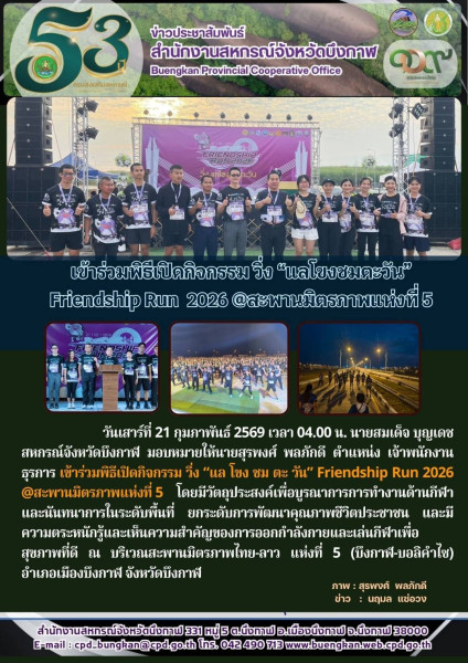 วันเสาร์ที่ 21 กุมภาพันธ์ 2569 เวลา 04.00 น. นายสมเด็จ บุญเดช สหกรณ์จังหวัดบึงกาฬ มอบหมายให้นายสุรพงศ์ พลภักดี ตำแหน่ง เจ้าพนักงานธุรการ เข้าร่วมพิธีเปิดกิจกรรม วิ่ง “แล โขง ชม ตะ วัน” Friendship Run 2026 @สะพานมิตรภาพแห่งที่ 5 โดยมีวัตถุประสงค์เพื่อบูรณาการการทำงานด้านกีฬาและนันทนาการในระดับพื้นที่ ยกระดับการพัฒนาคุณภาพชีวิตประชาชน และมีความตระหนักรู้และเห็นความสำคัญของการออกกำลังกายและเล่นกีฬาเพื่อสุขภาพที่ดี ณ บริเวณสะพานมิตรภาพไทย-ลาว แห่งที่ 5 (บึงกาฬ-บอลิคำไซ) อำเภอเมืองบึงกาฬ จังหวัดบึงกาฬ