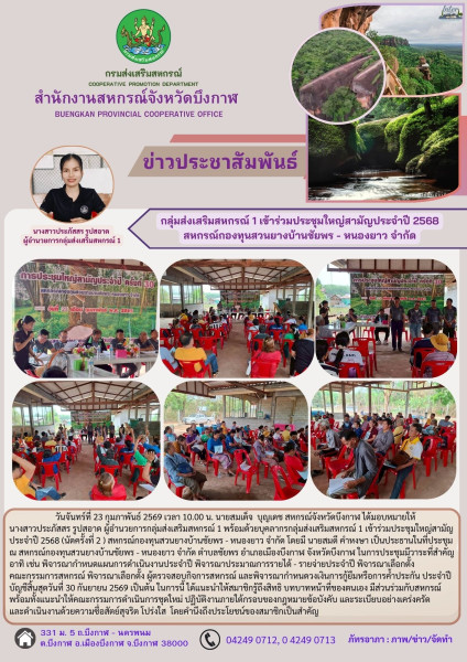 วันจันทร์ที่ 23 กุมภาพันธ์ 2569 เวลา 10.00 น. นายสมเด็จ บุญเดช สหกรณ์จังหวัดบึงกาฬ ได้มอบหมายให้ นางสาวประภัสสร รูปสอาด ผู้อำนวยการกลุ่มส่งเสริมสหกรณ์ 1 พร้อมด้วยบุคลากรกลุ่มส่งเสริมสหกรณ์ 1 เข้าร่วมประชุมใหญ่สามัญประจำปี 2568 (นัดครั้งที่ 2 ) สหกรณ์กองทุนสวนยางบ้านชัยพร - หนองยาว จำกัด โดยมี นายสมดี คำหงษา เป็นประธานในที่ประชุม ณ สหกรณ์กองทุนสวนยางบ้านชัยพร - หนองยาว จำกัด ตำบลชัยพร อำเภอเมืองบึงกาฬ จังหวัดบึงกาฬ ในการประชุมมีวาระที่สำคัญอาทิ เช่น พิจารณากำหนดแผนการดำเนินงานประจำปี พิจารณาประมาณการรายได้ - รายจ่ายประจำปี พิจารณาเลือกตั้งคณะกรรมการสหกรณ์ พิจารณาเลือกตั้ง ผู้ตรวจสอบกิจการสหกรณ์ และพิจารณากำหนดวงเงินการกู้ยืมหรือการค้ำประกัน ประจำปีบัญชีสิ้นสุดวันที่ 30 กันยายน 2569 เป็นต้น ในการนี้ ได้แนะนำให้สมาชิกรู้ถึงสิทธิ บทบาทหน้าที่ของตนเอง มีส่วนร่วมกับสหกรณ์ พร้อมทั้งแนะนำให้คณะกรรมการดำเนินการชุดใหม่ ปฏิบัติงานภายใต้กรอบของกฎหมายข้อบังคับ และระเบียบอย่างเคร่งครัด และดำเนินงานด้วยความซื่อสัตย์สุจริต โปร่งใส โดยคำนึงถึงประโยชน์ของสมาชิกเป็นสำคัญ