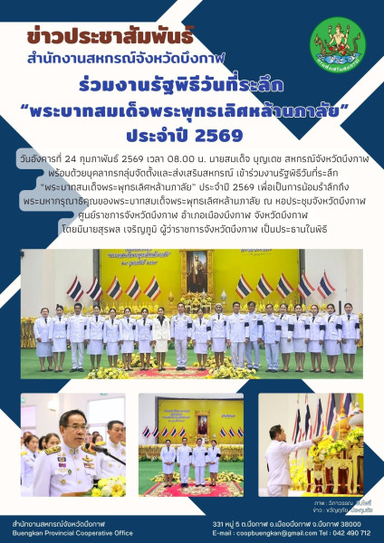 วันอังคารที่ 24 กุมภาพันธ์ 2569 เวลา 08.00 น. นายสมเด็จ บุญเดช สหกรณ์จังหวัดบึงกาฬ พร้อมด้วยบุคลากรกลุ่มจัดตั้งและส่งเสริมสหกรณ์ เข้าร่วมงานรัฐพิธีวันที่ระลึก “พระบาทสมเด็จพระพุทธเลิศหล้านภาลัย” ประจำปี 2569 เพื่อเป็นการน้อมรำลึกถึงพระมหากรุณาธิคุณของพระบาทสมเด็จพระพุทธเลิศหล้านภาลัย ณ หอประชุมจังหวัดบึงกาฬ ศูนย์ราชการจังหวัดบึงกาฬ อำเภอเมืองบึงกาฬ จังหวัดบึงกาฬ โดยมีนายสุรพล เจริญภูมิ ผู้ว่าราชการจังหวัดบึงกาฬ เป็นประธานในพิธี