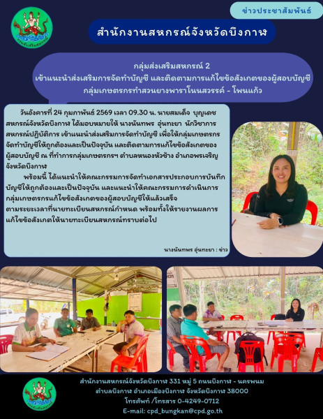 วันอังคารที่ 24 กุมภาพันธ์ 2569 เวลา 09.30 น. นายสมเด็จ บุญเดช สหกรณ์จังหวัดบึงกาฬ ได้มอบหมายให้ นางนันทพร อุ่นทะยา นักวิชาการสหกรณ์ปฏิบัติการ เข้าแนะนำส่งเสริมการจัดทำบัญชี เพื่อให้กลุ่มเกษตรกรจัดทำบัญชีให้ถูกต้องและเป็นปัจจุบัน และติดตามการแก้ไขข้อสังเกตของผู้สอบบัญชี ณ ที่ทำการกลุ่มเกษตรกรฯ ตำบลหนองหัวช้าง อำเภอพรเจริญ จังหวัดบึงกาฬ