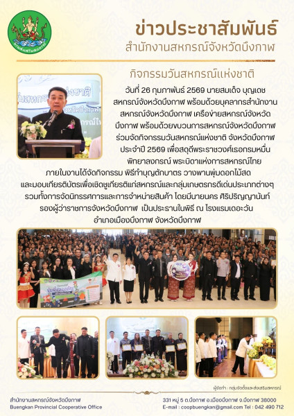 วันที่ 26 กุมภาพันธ์ 2569 นายสมเด็จ บุญเดช สหกรณ์จังหวัดบึงกาฬ พร้อมด้วยบุคลากรสำนักงานสหกรณ์จังหวัดบึงกาฬ เครือข่ายสหกรณ์จังหวัดบึงกาฬ พร้อมด้วยขบวนการสหกรณ์จังหวัดบึงกาฬ ร่วมจัดกิจกรรมวันสหกรณ์แห่งชาติ จังหวัดบึงกาฬ ประจำปี 2569 เพื่อสดุดีพระราชวงศ์เธอ กรมหมื่นพิทยาลงกรณ์ พระบิดาแห่งการสหกรณ์ไทย ภายในงานได้จัดกิจกรรม พิธีทำบุญตักบาตร วางพานพุ่มดอกไม้สด และมอบเกียรติบัตรเพื่อเชิดชูเกียรติแก่สหกรณ์และกลุ่มเกษตรกรดีเด่นประเภทต่างๆ รวมทั้งการจัดนิทรรศการและการจำหน่ายสินค้า โดยมีนายนคร ศิริปริญญานันท์ รองผู้ว่าราชการจังหวัดบึงกาฬ เป็นประธานในพิธี ณ โรงแรมเดอะวัน อำเภอเมืองบึงกาฬ จังหวัดบึงกาฬ