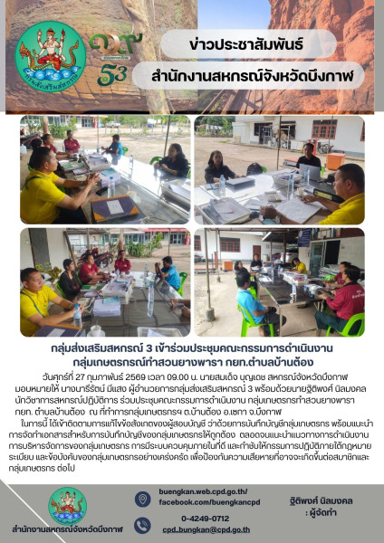 วันศุกร์ที่ 27 กุมภาพันธ์ 2569 เวลา 09.00 น. นายสมเด็จ บุญเดช สหกรณ์จังหวัดบึงกาฬ มอบหมายให้ นางนารีรัตน์ มีแสง ผู้อำนวยการกลุ่มส่งเสริมสหกรณ์ 3 พร้อมด้วยนายฐิติพงศ์ นิลมงคล นักวิชาการสหกรณ์ปฏิบัติการ ร่วมประชุมคณะกรรมการดำเนินงาน กลุ่มเกษตรกรทำสวนยางพารา