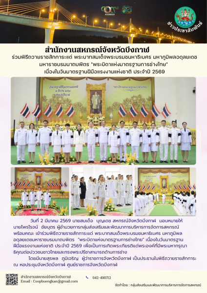 วันที่ 2 มีนาคม 2569 นายสมเด็จ บุญเดช สหกรณ์จังหวัดบึงกาฬ มอบหมายให้นายไพรโรจน์ ชัยบุตร ผู้อำนวยการกลุ่มส่งเสริมและพัฒนาการบริหารการจัดการสหกรณ์ พร้อมคณะ เข้าร่วมพิธีถวายราชสักการะแด่ พระบาทสมเด็จพระบรมชนหาธิเบศร มหาภูมิพลอดุลยเดชมหาราชบรมนาถบพิตร "พระบิดาแห่งมาตรฐานการช่างไทย" เนื่องในวันมาตรฐานฝีมือแรงงานแห่งชาติ ประจำปี 2569 เพื่อเป็นการเทิดพระเกียรติแด่พระองค์ที่มีพระมหากรุณาธิคุณต่อปววชนชาวไทยและทรงพระปรีชาสามารถด้านการช่าง โดยมีนายสุรพล ภูมิเจริญ ผู้ว่าราชการจังหวัดบึงกาฬ เป็นประธานในพิธีถวายราชสักการะ ณ หอประชุมจังหวัดบึงกาฬ ศูนย์ราชการจังหวัดบึงกาฬ