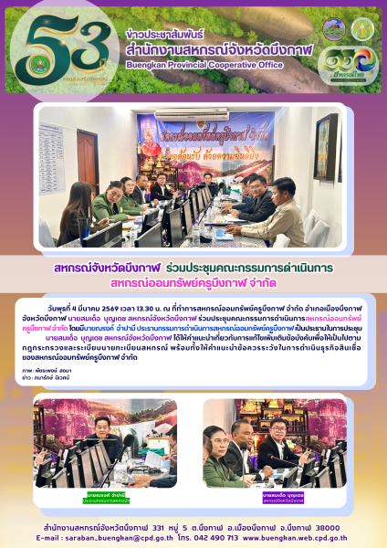 วันพุธที่ 4 มีนาคม 2569 เวลา 13.30 น. ณ ที่ทำการสหกรณ์ออมทรัพย์ครูบึงกาฬ จำกัด อำเภอเมืองบึงกาฬ จังหวัดบึงกาฬ นายสมเด็จ บุญเดช สหกรณ์จังหวัดบึงกาฬ ร่วมประชุมคณะกรรมการดำเนินการสหกรณ์ออมทรัพย์ครูบึงกาฬ จำกัด โดยมีนายณรงค์ จำปามี ประธานกรรมการดำเนินการสหกรณ์ออมทรัพย์ครูบึงกาฬ เป็นประธานในการประชุม