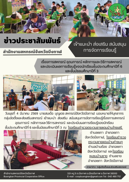 วันพุธที่ 4 มีนาคม 2569 นายสมเด็จ บุญเดช สหกรณ์จังหวัดบึงกาฬ มอบหมายให้บุคลากรกลุ่มจัดตั้งและส่งเสริมสหกรณ์ เข้าแนะนำ ส่งเสริม สนับสนุนการจัดการเรียนรู้เรื่องการสหกรณ์ อุดมการณ์ หลักการและวิธีการสหกรณ์ และประเมินผลการเรียนรู้ของนักเรียนชั้นประถมศึกษาปีที่ 6 และชั้นมัธยมศึกษาปีที่ 3 ณ โรงเรียนตำรวจตระเวนชายแดนบ้านไทยเสรี ตำบลเซกา อำเภอเซกา จังหวัดบึงกาฬ, โรงเรียนตำรวจตระเวนชายแดนบ้านคำชมภู ตำบลบ้านต้อง อำเภอเซกา จังหวัดบึงกาฬ และโรงเรียนชุมชนบ้านซาง ตำบลซาง อำเภอเซกา จังหวัดบึงกาฬ
