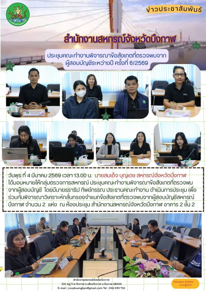 วันที่ 4 มีนาคม 2569 เวลา 13.00 น. นายสมเด็จ บุญเดช สหกรณ์จังหวัดบึงกาฬ ได้มอบหมายให้กลุ่มตรวจการสหกรณ์ ประชุมคณะทำงานพิจารณาข้อสังเกตที่ตรวจพบจากผู้สอบบัญชี โดยมีนายธราทิป ทิพย์กรรณ ประธานคณะทำงาน ดำเนินการประชุม เพื่อร่วมกันพิจารณาวิเคราะห์กลั่นกรองจำแนกข้อสังเกตที่ตรวจพบจากผู้สอบบัญชีสหกรณ์บึงกาฬ จำนวน 2 แห่ง ณ ห้องประชุุม สำนักงานสหกรณ์จังหวัดบึงกาฬ อาคาร 2 ชั้น 2