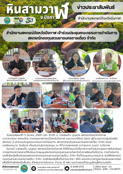 วันพฤษหัสบดีที่ 5 มีนาคม 2569 เวลา 10.00 น. นายสมเด็จ บุญเดช สหกรณ์จังหวัดบึงกาฬ นางวราภรณ์ พรหมจักร เกษตรและสหกรณ์จังหวัดบึงกาฬ และนางนารีรัตน์ มีแสง ผู้อำนวยการกลุ่มส่งเสริมสหกรณ์ 3 เข้าร่วมประชุมคณะกรรมการดำเนินการ สหกรณ์กองทุนสวนยางนครตาลเดี่ยว จำกัด โดยมีนายโชคสะอาด วิณโรจน์ เป็นประธานในการประชุม ณ ที่ทำการสหกรณ์ฯ ต.ท่าสะอาด อ.เซกา จ.บึงกาฬ