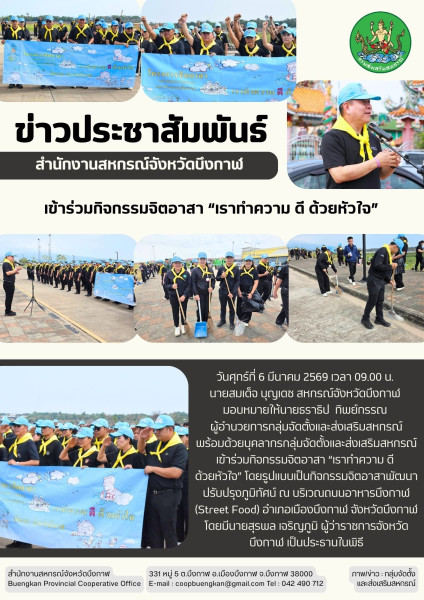วันศุกร์ที่ 6 มีนาคม 2569 เวลา 09.00 น. นายสมเด็จ บุญเดช สหกรณ์จังหวัดบึงกาฬ มอบหมายให้นายธราธิป ทิพย์กรรณ ผู้อำนวยการกลุ่มจัดตั้งและส่งเสริมสหกรณ์ พร้อมด้วยบุคลากรกลุ่มจัดตั้งและส่งเสริมสหกรณ์ เข้าร่วมกิจกรรมจิตอาสา “เราทำความ ดี ด้วยหัวใจ” โดยรูปแบบเป็นกิจกรรมจิตอาสาพัฒนา ปรับปรุงภูมิทัศน์ ณ บริเวณถนนอาหารบึงกาฬ (Street Food) อำเภอเมืองบึงกาฬ จังหวัดบึงกาฬ โดยมีนายสุรพล เจริญภูมิ ผู้ว่าราชการจังหวัดบึงกาฬ เป็นประธานในพิธี