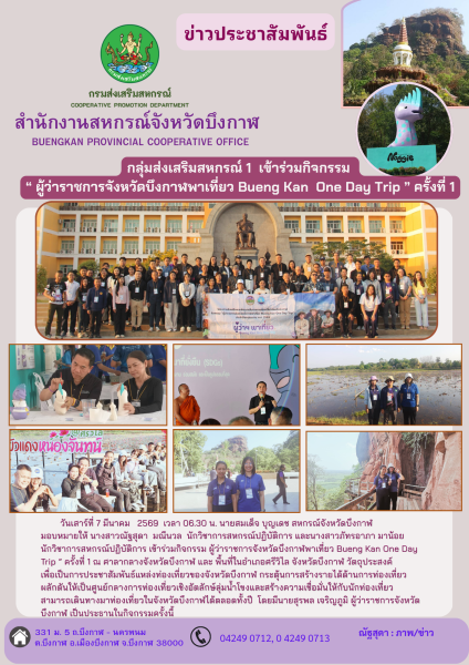 วันเสาร์ที่ 7 มีนาคม 2569 เวลา 06.30 น. นายสมเด็จ บุญเดช สหกรณ์จังหวัดบึงกาฬ มอบหมายให้ นางสาวณัฐสุดา มณีนวล นักวิชาการสหกรณ์ปฏิบัติการ และนางสาวภัทรอาภา มาน้อย นักวิชาการสหกรณ์ปฏิบัติการ เข้าร่วมกิจกรรม ผู้ว่าราชการจังหวัดบึงกาฬพาเที่ยว Bueng Kan One Day Trip ” ครั้งที่ 1 ณ ศาลากลางจังหวัดบึงกาฬ และ พื้นที่ในอำเภอศรีวิไล จังหวัดบึงกาฬ วัตถุประสงค์เพื่อเป็นการประชาสัมพันธ์แหล่งท่องเที่ยวของจังหวัดบึงกาฬ กระตุ้นการสร้างรายได้ด้านการท่องเที่ยวผลักดันให้เป็นศูนย์กลางการท่องเที่ยวเชิงอัตลักษ์ลุ่มน้ำโขงและสร้างความเชื่อมั่นให้กับนักท่องเที่ยวสามารถเดินทางมาท่องเที่ยวในจังหวัดบึงกาฬได้ตลอดทั้งปี โดยมีนายสุรพล เจริญภูมิ ผู้ว่าราชการจังหวัดบึงกาฬ เป็นประธานในกิจกรรมครั้งนี้