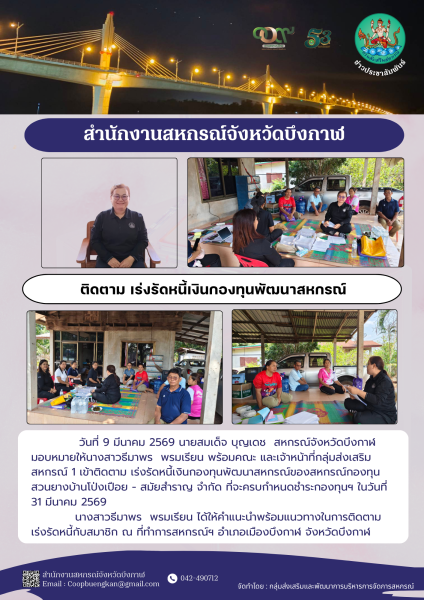 วันที่ 9 มีนาคม 2569 นายสมเด็จ บุญเดช สหกรณ์จังหวัดบึงกาฬ มอบหมายให้นางสาวธีมาพร พรมเรียน พร้อมคณะ และเจ้าหน้าที่กลุ่มส่งเสริมสหกรณ์ 1 เข้าติดตาม เร่งรัดหนี้เงินกองทุนพัฒนาสหกรณ์ของสหกรณ์กองทุนสวนยางบ้านโป่งเปือย - สมัยสำราญ จำกัด ที่จะครบกำหนดชำระกองทุนฯ ในวันที่ 31 มีนาคม 2569