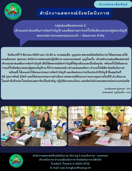 วันจันทร์ที่ 9 มีนาคม 2569 เวลา 13.30 น. นายสมเด็จ บุญเดช สหกรณ์จังหวัดบึงกาฬ ได้มอบหมายให้ นางนันทพร อุ่นทะยา นักวิชาการสหกรณ์ปฏิบัติการ และนายกตตน์ บุญไชยโย เจ้าพนักงานส่งเสริมสหกรณ์ เข้าแนะนำส่งเสริมการจัดทำบัญชี เพื่อให้สหกรณ์จัดทำบัญชีให้ถูกต้องและเป็นปัจจุบัน พร้อมทั้งได้ติดตามการแก้ไขข้อสังเกตของผู้สอบบัญชี ณ ที่ทำการสหกรณ์ฯ ตำบลหนองพันทา อำเภอโซ่พิสัย จังหวัดบึงกาฬ