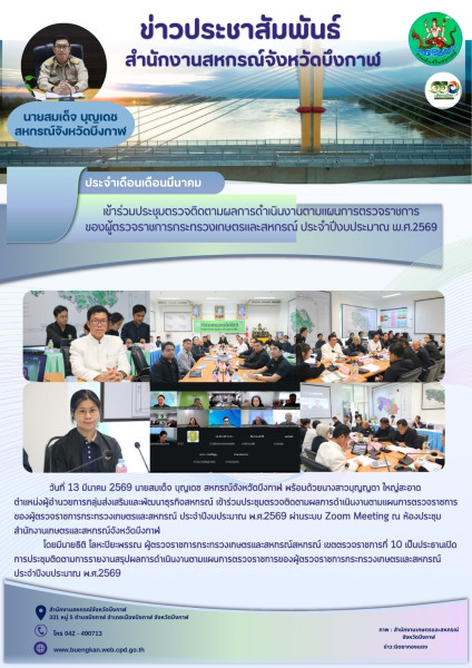 วันที่ 13 มีนาคม 2569 นายสมเด็จ บุญเดช สหกรณ์จังหวัดบึงกาฬ พร้อมด้วยนางสาวบุญญดา ใหญ่สะอาด ตำแหน่งผู้อำนวยการกลุ่มส่งเสริมและพัฒนาธุรกิจสหกรณ์ เข้าร่วมประชุมตรวจติดตามผลการดำเนินงานตามแผนการตรวจราชการของผู้ตรวจราชการกระทรวงเกษตรและสหกรณ์ ประจำปีงบประมาณ พ.ศ.2569 ผ่านระบบ Zoom Meeting ณ ห้องประชุมสำนักงานเกษตรและสหกรณ์จังหวัดบึงกาฬ โดยมีนายธิติ โลหะปิยะพรรณ ผู้ตรวจราชการกระทรวงเกษตรและสหกรณ์สหกรณ์ เขตตรวจราชการที่ 10 เป็นประธานเปิดการประชุมติดตามการรายงานสรุปผลการดำเนินงานตามแผนการตรวจราชการของผู้ตรวจราชการกระทรวงเกษตรและสหกรณ์ ประจำปีงบประมาณ พ.ศ.2569