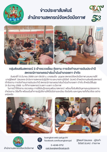 วันศุกร์ที่ 13 มีนาคม 2569 เวลา 09.00 น. นายสมเด็จ บุญเดช สหกรณ์จังหวัดบึงกาฬ มอบหมายให้ นายฐิติพงศ์ นิลมงคล นักวิชาการสหกรณ์ปฏิบัติการ และนางสาวจีรโชติ นิเวศน์ เจ้าพนักงานส่งเสริมสหกรณ์ เข้าติดตาม การจัดทำงบการเงินประจำปี สหกรณ์การเกษตรปาล์มน้ำมันอำเภอเซกา จำกัด สำหรับปีสิ้นสุด 31 ธันวาคม 2568 ณ ที่ทำการสหกรณ์ ต.เซกา อ.เซกา จ.บึงกาฬ