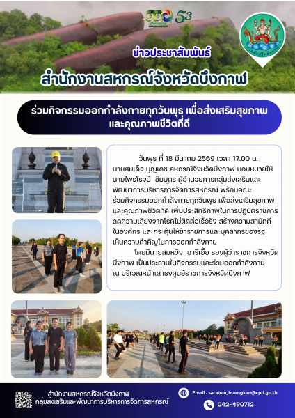 วันพุธ ที่ 18 มีนาคม 2569 เวลา 17.00 น. นายสมเด็จ บุญเดช สหกรณ์จังหวัดบึงกาฬ มอบหมายให้นายไพรโรจน์ ชัยบุตร ผู้อำนวยการกลุ่มส่งเสริมและพัฒนาการบริหารการจัดการสหกรณ์ พร้อมคณะ ร่วมกิจกรรมออกกำลังกายทุกวันพุธ เพื่อส่งเสริมสุขภาพและคุณภาพชีวิตที่ดี เพิ่มประสิทธิภาพในการปฏิบัติราชการ ลดความเสี่ยงจากโรคไม่ติดต่อเรื้อรัง สร้างความสามัคคีในองค์กร และกระตุ้นให้ข้าราชการและบุคลากรของรัฐเห็นความสำคัญในการออกกำลังกาย โดยมีนายสมหวัง อารีเอื้อ รองผู้ว่าราชการจังหวัดบึงกาฬ เป็นประธานในกิจกรรมและร่วมออกกำลังกาย ณ บริเวณหน้าเสาธงศูนย์ราชการจังหวัดบึงกาฬ
