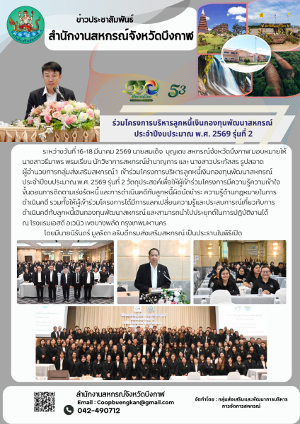 ระหว่างวันที่ 16-18 มีนาคม 2569 นายสมเด็จ บุญเดช สหกรณ์จังหวัดบึงกาฬ มอบหมายให้นางสาวธีมาพร พรมเรียน นักวิชาการสหกรณ์ชำนาญการ และ นางสาวประภัสสร รูปสอาด ผู้อำนวยการกลุ่มส่งเสริมสหกรณ์ 1 เข้าร่วมโครงการบริหารลูกหนี้เงินกองทุนพัฒนาสหกรณ์ ประจำปีงบประมาณ พ.ศ. 2569 รุ่นที่ 2 วัตถุประสงค์เพื่อให้ผู้เข้าร่วมโครงการมีความรู้ความเข้าใจขั้นตอนการติดตามเร่งรัดหนี้ และการดำเนินคดีกับลูกหนี้ผิดนัดชำระ ความรู้ด้านกฎหมายในการดำเนินคดี รวมทั้งให้ผู้เข้าร่วมโครงการได้มีการแลกเปลี่ยนความรู้และประสบการณ์เกี่ยวกับการดำเนินคดีกับลูกหนี้เงินกองทุนพัฒนาสหกรณ์ และสามารถนำไปประยุกต์ในการปฎิบัติงานได้ ณ โรงแรมเอสดี อเวนิว เขตบางพลัด กรุงเทพมหานคร โดยมีนายนิรันดร์ มูลธิดา อธิบดีกรมส่งเสริมสหกรณ์ เป็นประธานในพิธิเปิด