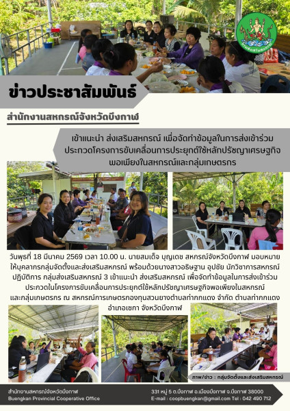 วันพุธที่ 18 มีนาคม 2569 เวลา 10.00 น. นายสมเด็จ บุญเดช สหกรณ์จังหวัดบึงกาฬ มอบหมายให้บุคลากรกลุ่มจัดตั้งและส่งเสริมสหกรณ์ พร้อมด้วยนางสาวอธิษฐาน อุปชัย นักวิชาการสหกรณ์ปฏิบัติการ กลุ่มส่งเสริมสหกรณ์ 3 เข้าแนะนำ ส่งเสริมสหกรณ์ เพื่อจัดทำข้อมูลในการส่งเข้าร่วมประกวดในโครงการขับเคลื่อนการประยุกต์ใช้หลักปรัชญาเศรษฐกิจพอเพียงในสหกรณ์และกลุ่มเกษตรกร ณ สหกรณ์การเกษตรกองทุนสวนยางตำบลท่ากกแดง จำกัด ตำบลท่ากกแดง อำเภอเซกา จังหวัดบึงกาฬ